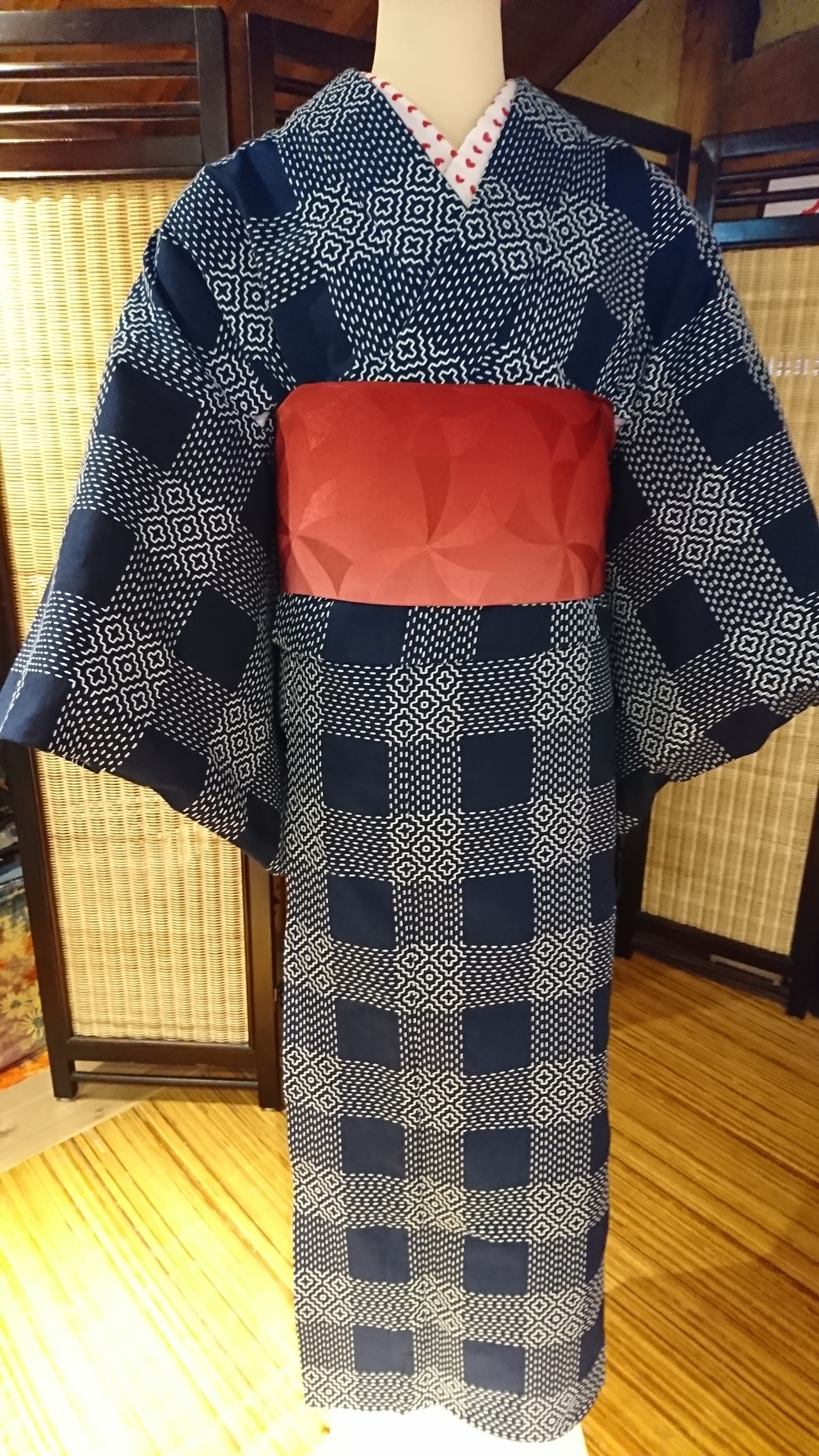刺し子で柄付けしているデニム着物です。生地は刺し子なのでしっかりしています。