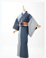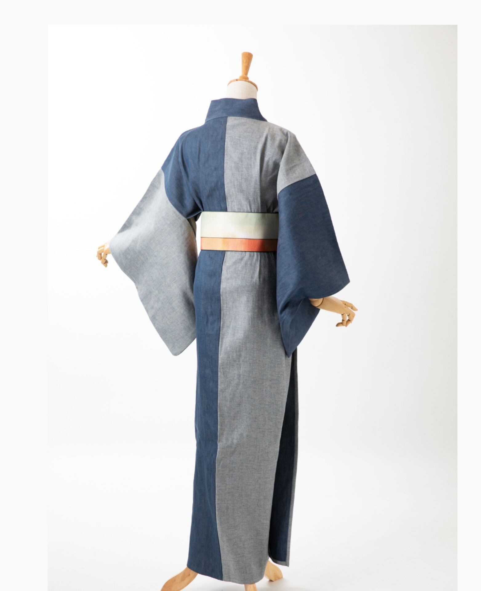 どなたでも簡単に着ることのできるデニム着物です。おはしょりはなく、ラップワンピースの様に着れます。洗濯しても色落ちしない生地です。